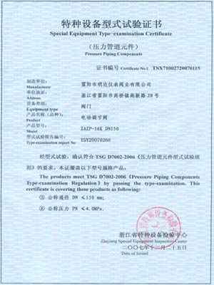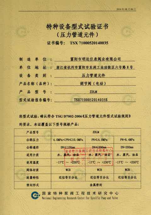 电动调节阀型式试验证书