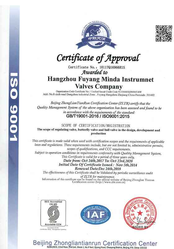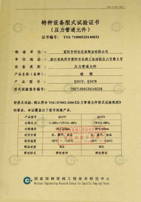 蝶阀调节阀型式试验证书